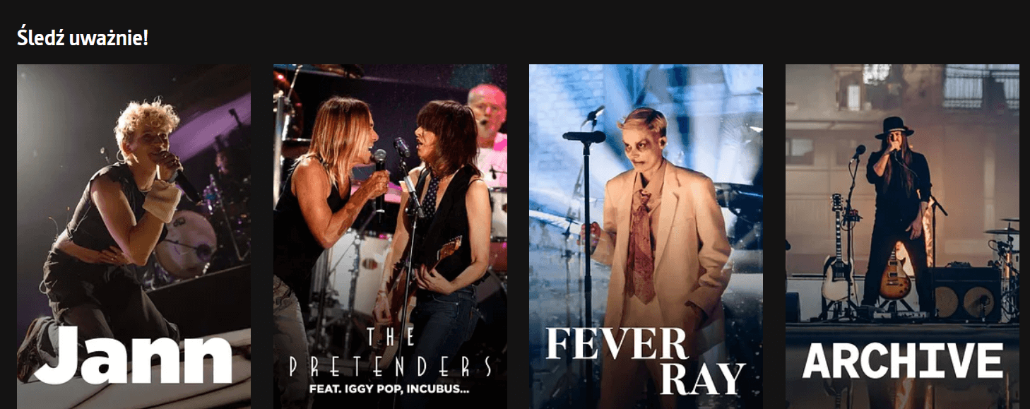 Canal+ dla młodej widowni przygotował koncerty Young Leosi, Sobla, Maty, Margaret i Julii Żugaj. Dla starszego odbiorcy zaś są występy Natalii Kukulskiej, Problemu, Mroza. Dodatkowo w serwisie znajdują się obecnie dwa koncerty zagraniczne: jeden U2, drugi The Weeknd (ten sam, który można zobaczyć w HBO Max).