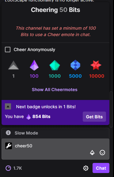 Dawniej widzowie streamingu na Twitchu mogli wyróżnić swoje wiadomości nie tylko za pomocą Bitsów i np. cheermotikonów, ale także dzięki Hype Chatowi. Była to płatna opcja przypinania wiadomości na górze czatu tak, aby streamer mógł ją zobaczyć w gąszczu innych, niekiedy pędzących jak rakieta wiadomości wysyłanych przez pozostałych użytkowników.